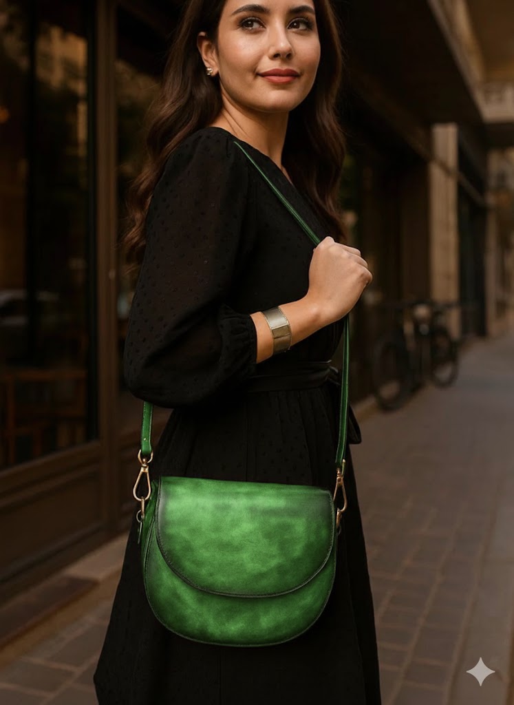 شنطة كتف جلد طبيعي فاخر، مصنوعة يدويًا ومُلوّنة بتقنية الباتينا الحرفية التي تمنح كل قطعة طابعًا فريدًا لا يتكرر.