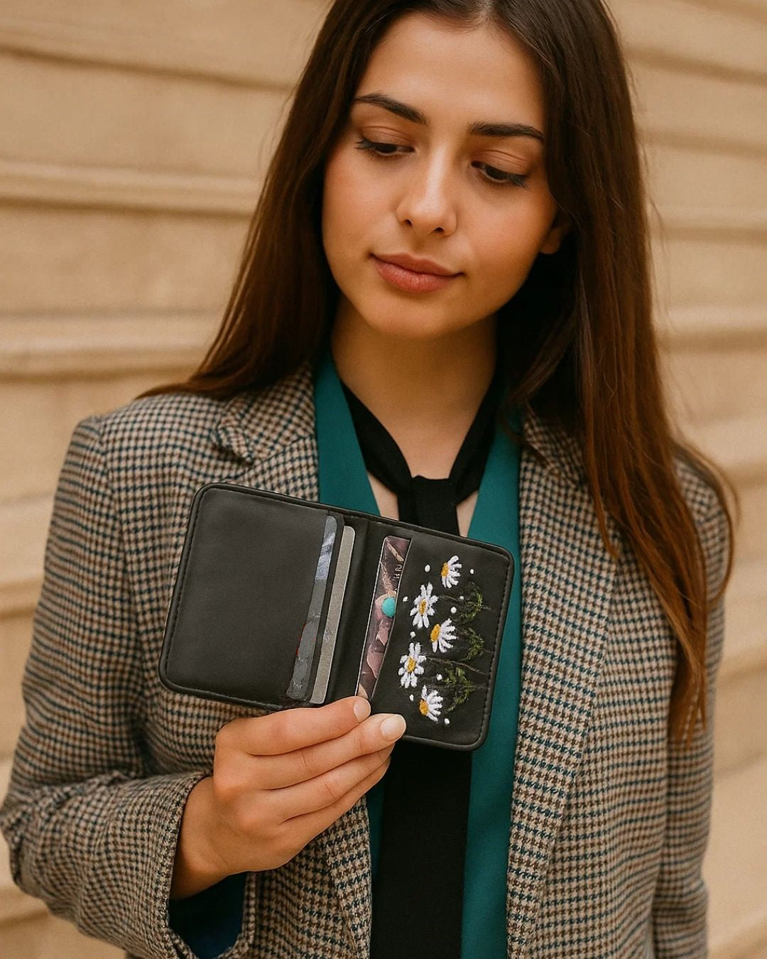 Add a touch of charm and elegance to your everyday essentials with this beautifully embroidered women’s card wallet. Crafted from smooth faux leather , it features delicate white floral stitching that brings a feminine and refined look.