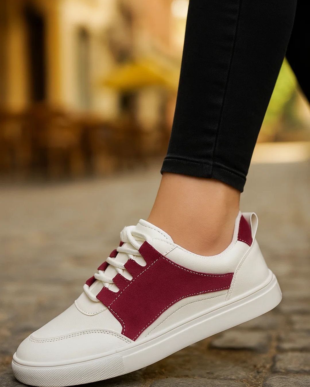 Step into effortless style with the Aura Sneaker — where sleek white leather meets rich maroon suede for a bold yet balanced look. Designed for women who love comfort without compromising on aesthetics.