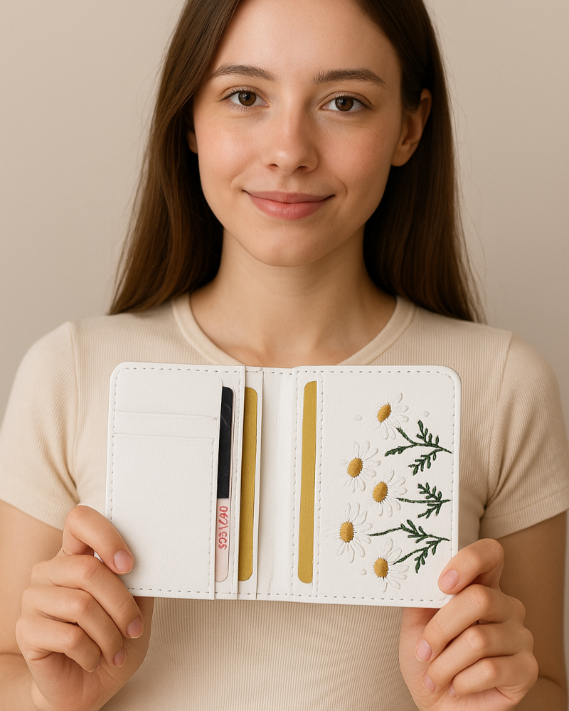 Add a touch of charm and elegance to your everyday essentials with this beautifully embroidered women’s card wallet. Crafted from smooth faux leather , it features delicate white floral stitching that brings a feminine and refined look.